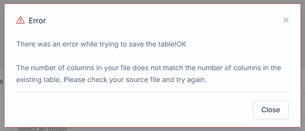 “The number of columns in your file does not match the number of columns in the existing table”